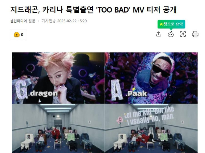 大家好呀,这里是你们的小娱~今天咱们来聊聊韩娱圈的大新闻!据韩国媒体2月22日报道,权志龙G-Dragon的新专辑《Übermensch》主打歌《TOO BAD》的预告片终于公开了!不仅如此,aespa的柳智敏Karina还惊喜出演,这波操作简直让人直呼“神仙组合”!